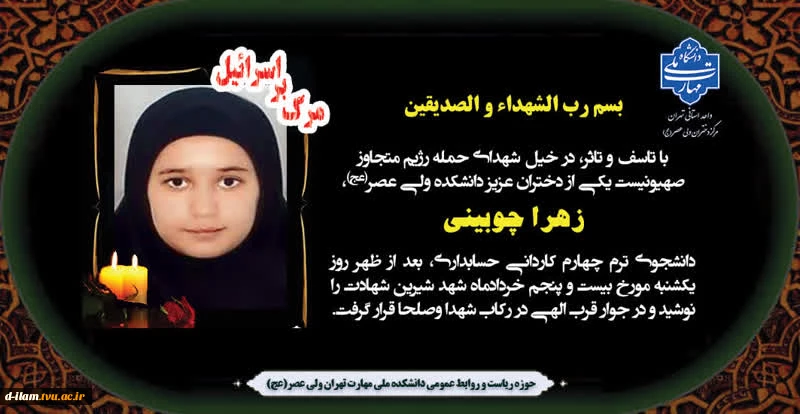 امتیاز دهید : پیام تسلیت وزیر علوم در پی شهادت سرکار خانم زهرا چوبینی، دانشجوی دانشگاه ملی مهارت 2 دوشنبه 9 تیر 1404 ساعت 11:18