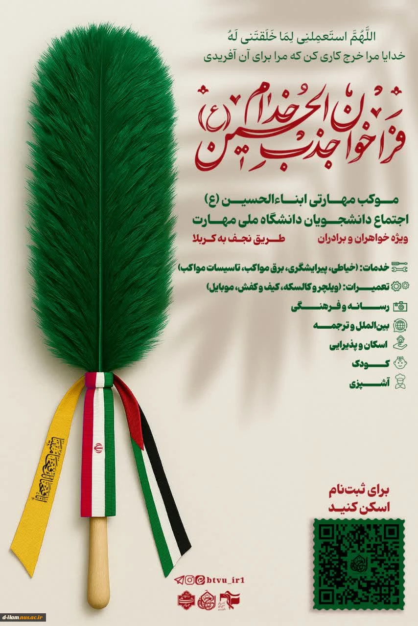امتیاز دهید : فراخوان ثبت نام خادم موکب مهارتی ابناءالحسین(ع) ویژه دانشجویان دانشگاه ملی مهارت سراسرکشور(خواهران و برادران) اربعین1404 2 یکشنبه 22 تیر 1404 ساعت 8:23