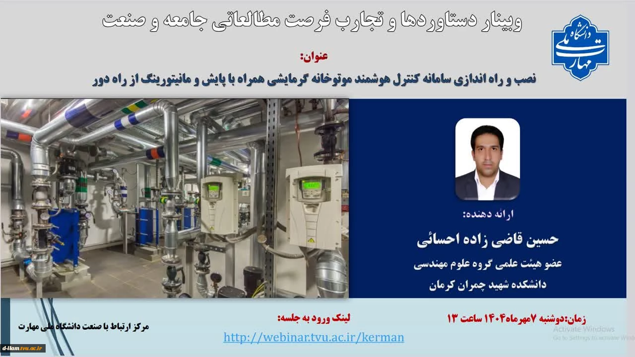 امتیاز دهید : وبینار دستاوردها وتجارب فرصت مطالعاتی جامعه وصنعت آقای حسین قاضی زاده احسائی عضو هیأت علمی گروه علوم مهندسی دانشکده شهید چمران کرمان با عنوان " نصب و راه اندازی سامانه کنترل هوشمند موتورخانه گرمایشی همراه با پایش ومانیتورینگ از راه دور " 2 شنبه 5 مهر 1404 ساعت 15:04